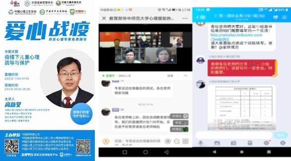 中国健康管理协会、中国灾害防御协会、中国心理卫生协会等协会,在国家互联网服务平台网家家共同推出“大型疫情防控心理知识系列主题直播暨专家在线答疑指导活动——爱心战疫”。百名心理专家免费在线指导答疑,从心理学的视角为大家科普心理学防疫知识,用爱守护心灵。心理学系应用心理学党支部高新义老师积极参与其中,2月5日,高老师走进直播间,作了题为《疫情下儿童心理疏导与保护》的专题辅导。他从疫情对儿童的影响、如何对疫情下儿童进行心理保护、儿童心理干预的方法与技术等三个方面为广大听众深入讲解了如何在疫情下为儿童提供心理支持,保证儿童的心理安全。观看人数达到11万。直播结束后,高新义老师来到“爱心战疫”官方特群与网友进行了互动与答疑。