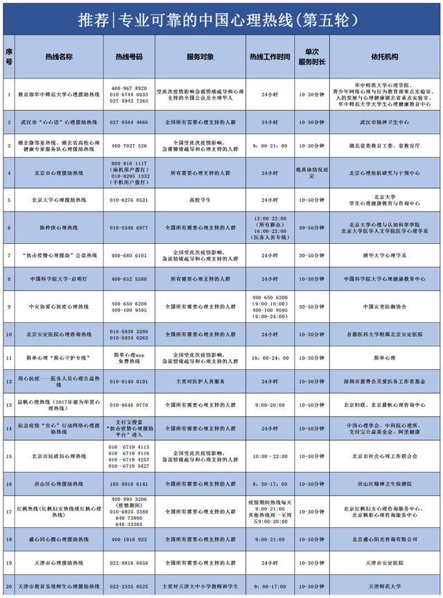 本次中国心理热线服务调查项目由中国心理学会临床心理学注册工作委员会(注册系统)、中国心理学会临床与咨询心理学专业委员会联合发起,湖北东方明见心理健康研究所承办。该项目于2020年2月15日启动,至今已经对425 条心理热线进行了调查。通过对热线工作场所设备、热线咨询员专业资质、服务规范、管理规范五个维度23个评估指标的评价,筛选出了78条评分高热线,色情网站 对外心理援助热线0536-2602333名列其中,并在CPS临床心理注册系统平台对民众进行了公布,作为常态化的年度心理援助热线向社会提供心理援助服务。