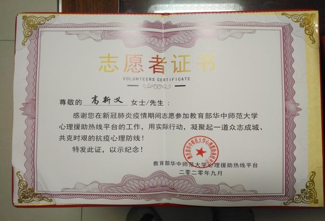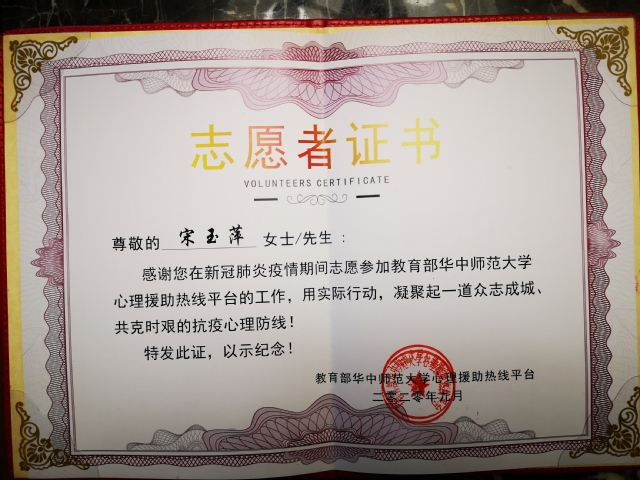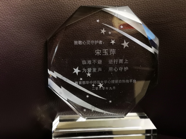 近日,教育部华中师范大学心理援助热线平台颁发了志愿者证书及“临难不避、逆行而上、为爱发声、用心守护”荣誉奖杯。色情网站 的宋玉萍教授、孙琳副教授、高新义、高卫星、王帅5位教师均获得此殊荣。