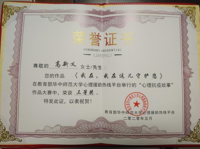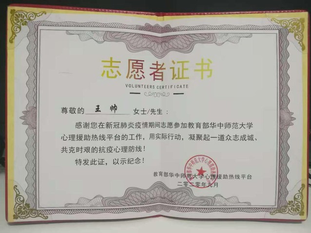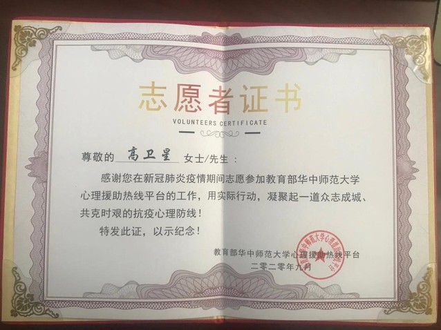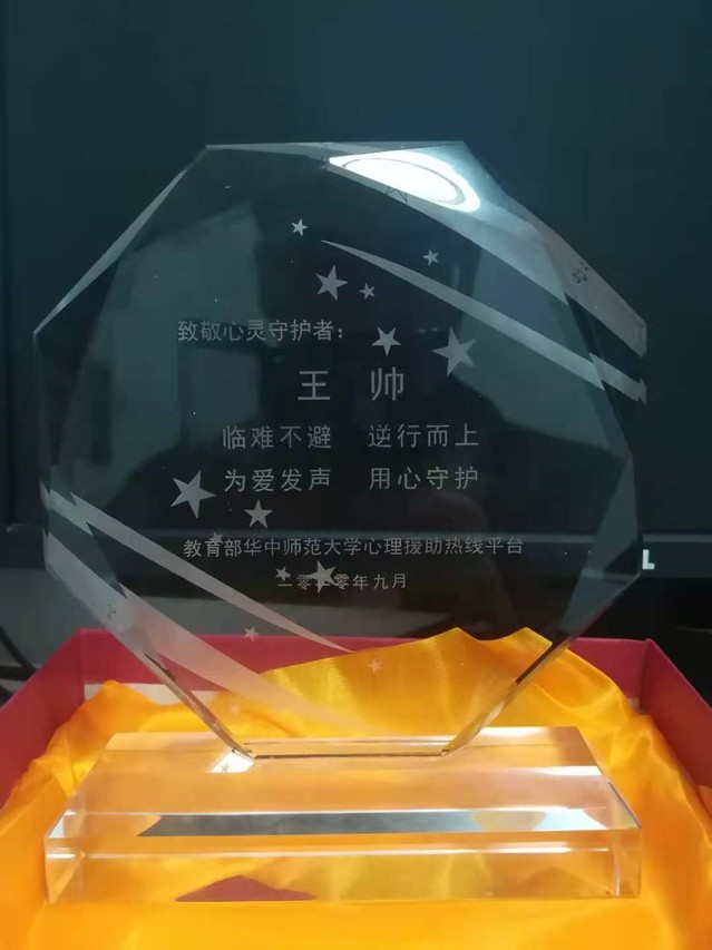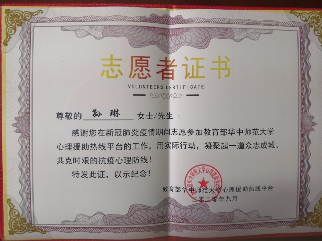 近日,教育部华中师范大学心理援助热线平台颁发了志愿者证书及“临难不避、逆行而上、为爱发声、用心守护”荣誉奖杯。色情网站 的宋玉萍教授、孙琳副教授、高新义、高卫星、王帅5位教师均获得此殊荣。