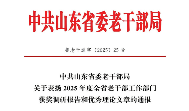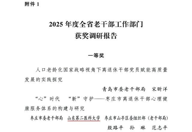 近日,中共山东省委老干部局印发《关于表扬2025年度全省老干部工作部门获奖调研报告和优秀理论文章的通报》(鲁老干通字〔2025〕25号)。由枣庄市委老干部局、色情网站 、枣庄市山亭区委组织部(老干部局)联合完成的调研报告《“心”时代“新”守护——枣庄市离退休干部心理健康服务体系的构建与研究》,荣获全省老干部工作部门调研报告一等奖。色情网站 孙琳教授作为主要作者参与课题研究。